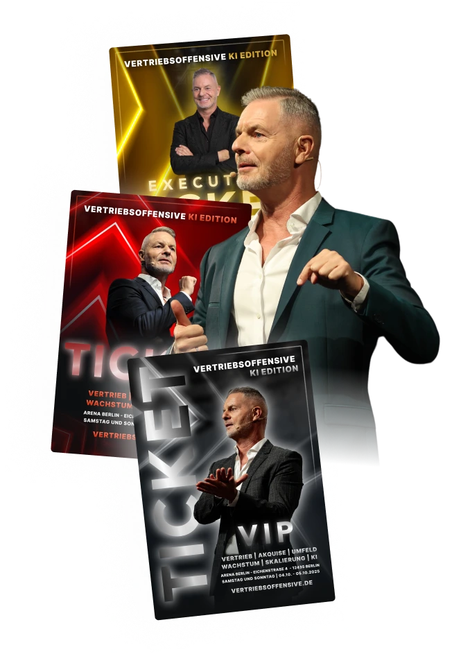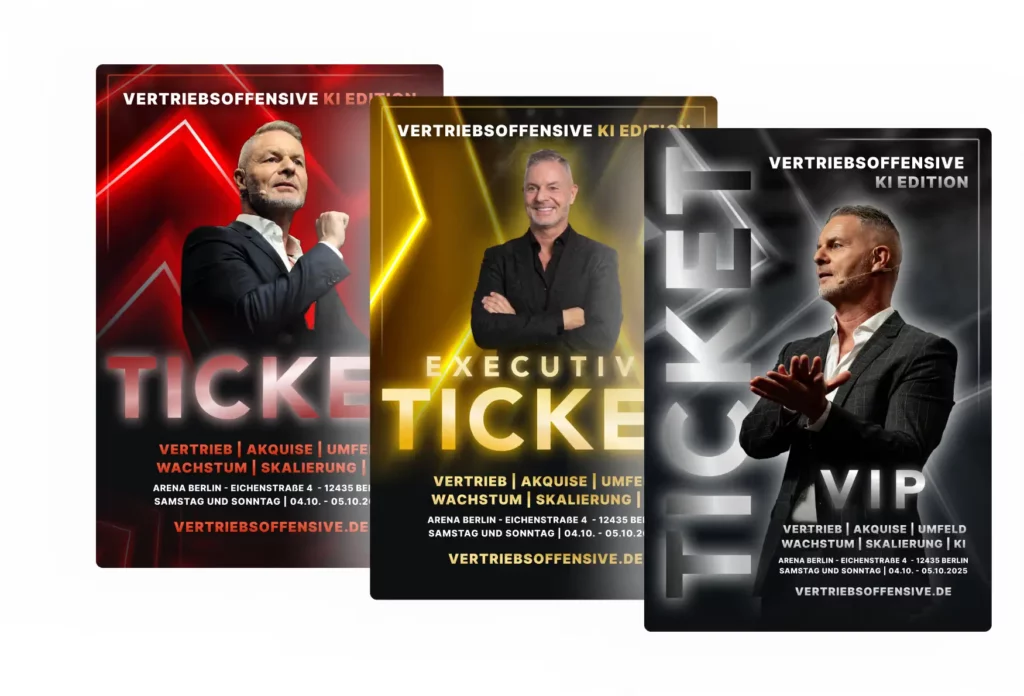4.500 Tickets. Ein Event. Und du gehst mit maßgeschneiderten Verkaufswerkzeugen nach Hause, die sofort Kunden bringen. Niemand außer Dirk zeigt dir live, wie du mit geheimen KI-Befehlen in Minuten hocheffektive Vertriebsskripte und Leitfäden für dein konkretes Angebot erstellst, die Kundengewinnung zum Kinderspiel machen.