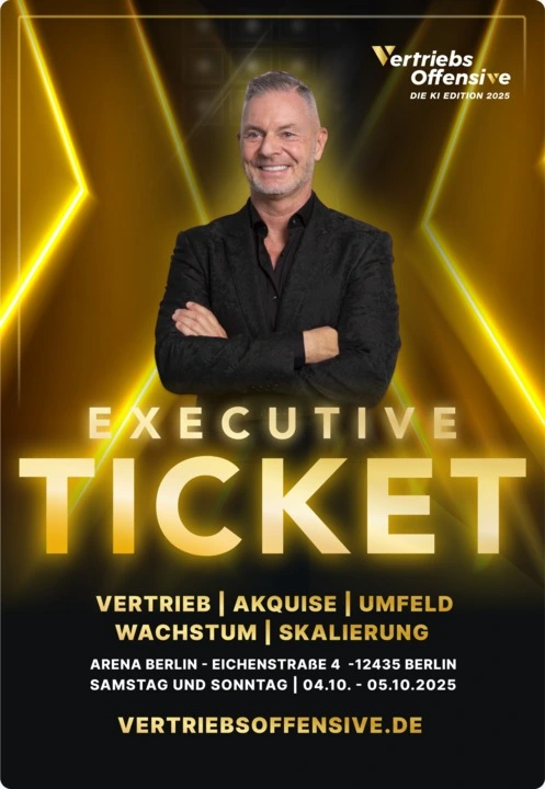 Die Vertriebsoffensive 2025 ist das größte Vertriebsevent Europas. Ein unvergessliches Vertriebs-Seminar von und mit Dirk Kreuter, das in diesem Jahr nur live und vor Ort in Berlin stattfindet: am 04.10. und 05.10.25.